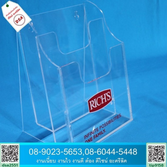 รับทำอะคริลิคใส่โบรชัวร์ กล่องใส่โบรชัวร์อะคริลิคใส ผลิตจากอะคริลิคแท้ ใส ทนทาน ช่วยให้โบรชัวร์ แผ่นพับของคุณตั้งวางได้อย่างสวยงาม น่าหยิบอ่าน มีกล่องใส่โบรชัวร์ให้คุณเลือกได้หลายลักษณะ ไม่ว่าจะเป็นกล่องใส่โบรชัวร์สำหรับตั้งโต๊ะ กล่องใส่โบรชัวร์สำหรับติดผนัง เพื่อแจกโบรชัวร์ แผ่นพับ ป้ายโฆษณาต่างๆ เพื่อการทำประชาสัมพันธ์ หรือโปรโมชั่นของร้านคุณมีให้เลือกทั้งแนวตั้งและแนวนอน สามารถสั่งผลิตได้หลากหลายสีที่ต้องการ Line : dsa2551 Line : tip9158